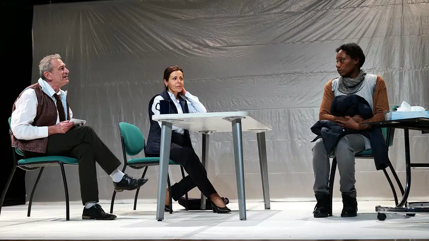 Reconnue au Royaume-Uni pour ses oeuvres engagées, Debbie Tucker Green nous entraîne dans un univers captivant, inscrit dans un futur proche. Dans ce récit en huis clos mâtiné d’humour noir, une victime est convoquée dans un bureau administratif. Il s’agit d’une procédure légale. Visiblement formés à la va-vite, les deux agents qui la prennent en charge sont bien en peine de la « mettre à l’aise » comme ils en ont reçu la directive… Ils s’empêtrent dans leurs explications, jusqu’à faire parfois basculer l’ambiance vers l’absurde.